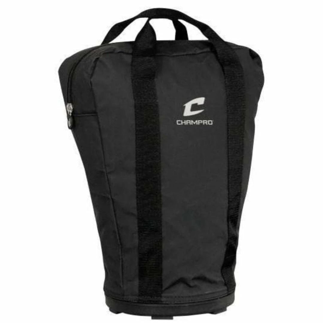 This water-resistant Deluxe Ball Bag by Champro Sports boasts a 600D polyester construction with an inner lining. The main compartment has a zipper closure and will hold 48 baseballs or 24 softballs. The web handles are 2-inches wide, and the bag has a 9-inch bottom diameter and is 17-inches tall.