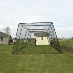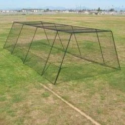 This cage is built with a metal framework that is trapezoid in shape – 10 foot at the top, 14 foot at the bottom, with a 10 foot height leaving plenty of room to hit. This framework is constructed of 3/4 EMT electrical conduit. (Don’t let the size fool you, this cage is real all the way from college teams, to facilities, high schools, and individuals that want to just put it up and use it.)