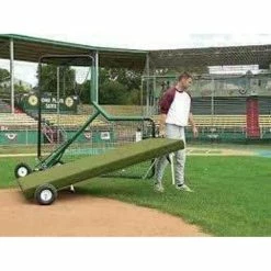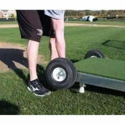Made from a fully reinforced aluminum frame, the platform is covered in a highly durable, spike-resistant turf. It has wheels and handles for easy transport that won’t tear up playing surfaces.