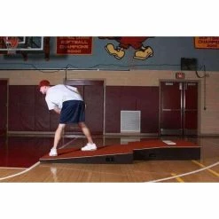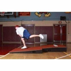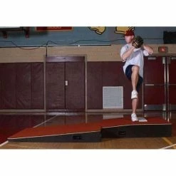 The ProMounds Professional 2-piece Mound with Turf is made with high density foam and is protected for durability with ProMounds Rubber Armor Technology (P.R.A.T.). This technology ensures a skid proof mound that will not damage any gym floor. The combination of the foam core and P.R.A.T. distinguishes these pitching mounds as the most durable and lightweight models on the market today. It is lightweight at 128 pounds yet durable and comes with two handles at each side for easier transport and storage. Dimensions are 9′ Long by 4′ wide by 10″ high. Cleats are ok with this mound.